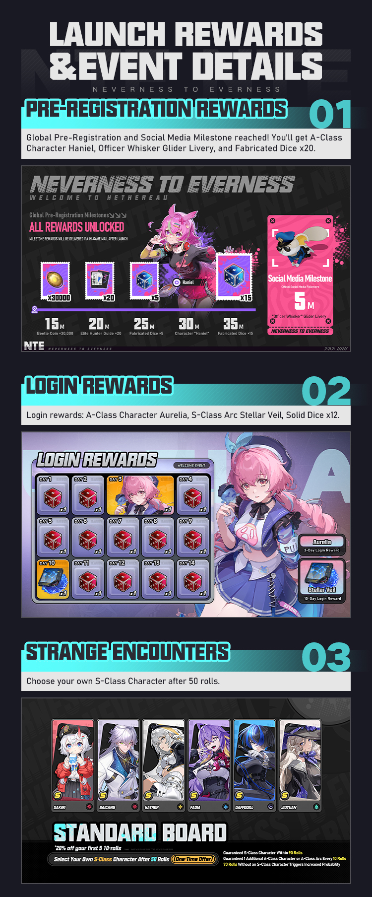 Neverness to Everness (NTE) is a supernatural open-world RPG developed by Hotta Studio. The story begins in the city of Hethereau, where you play as the first "unlicensed" Anomaly Hunter. You will join the antique shop Eibon, which relies on taking on Anomaly commissions from the public to stay afloat. Alongside your diverse and extraordinary partners, you'll explore various urban mysteries, experiencing an array of adventures filled with laughter and tears, and crafting your unique urban saga.