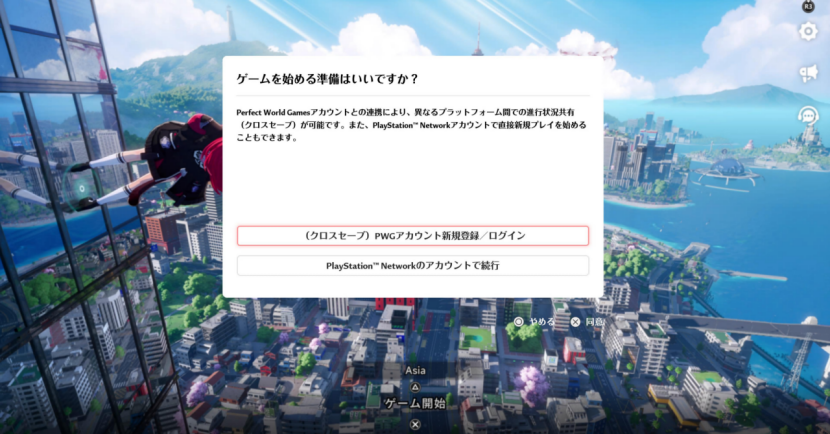 A:PSNアカウントとPWGアカウント(メールアドレス)の連携は、異なるプラットフォーム間でゲームの進捗を共有するための前提条件となります(クロスセーブ)。初回ログイン時に連携をご希望の場合は、これまでにPWGアカウントをメールアドレスで登録したことがあるかどうかにかかわらず、初めてゲームにログインした後、以下の画面で「(クロスセーブ)PWGアカウント新規登録/ログイン」を選択し、ログイン/登録および連携手続きを行ってください。